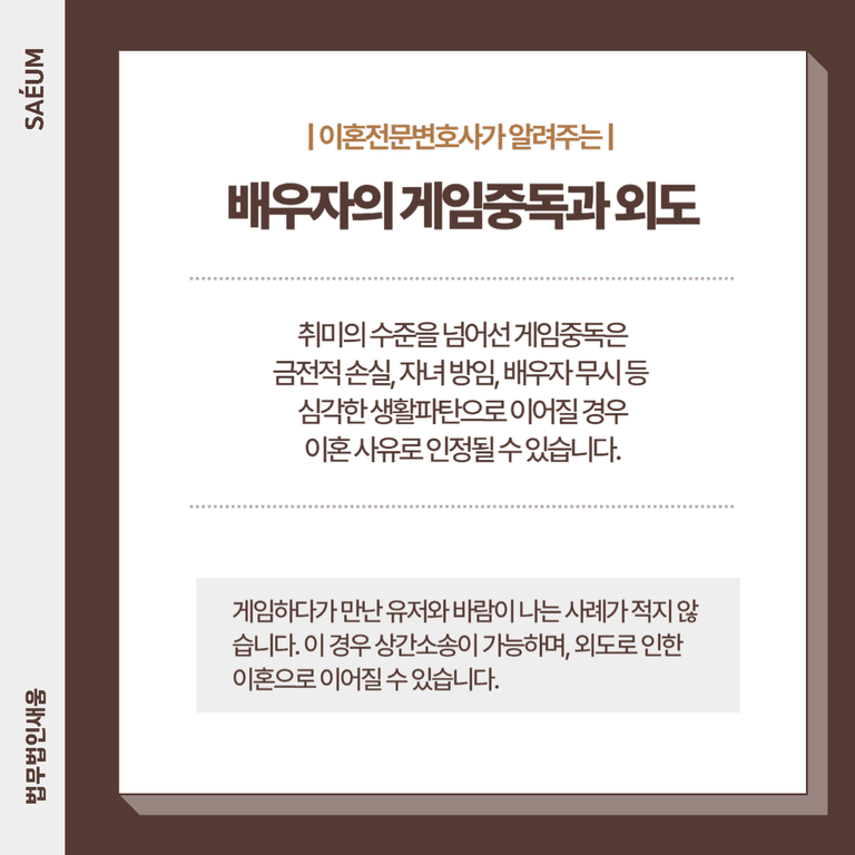 최근에는 단순한 취미의 수준을 넘어선 게임중독이 혼인관계에 악영향을 미치는 사례가 늘고 있습니다. 특히 금전적 손실, 자녀 방임, 배우자 무시 등 심각한 생활파탄으로 이어질 경우, 이혼 사유로 인정되며 이후 외도로까지 이어질 때 상간소송의 단초가 됩니다.