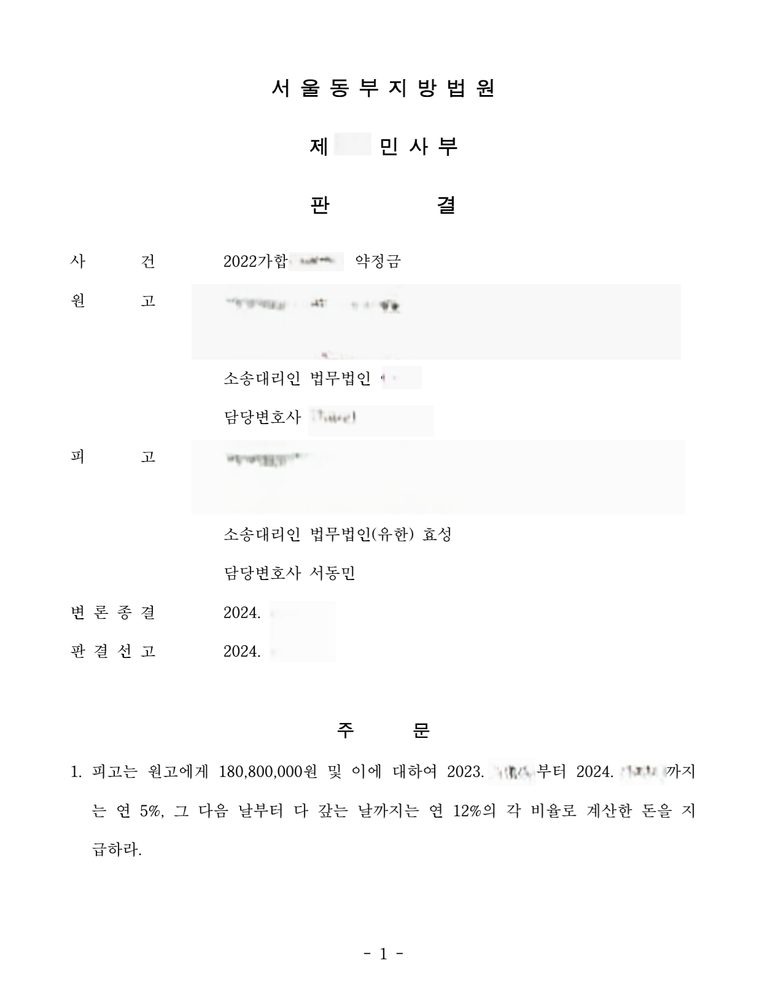 저는 즉각 응소하여 약정금 채무의 부존재를 주장 입증하였고 법원은 원고 청구액의 상당액을 기각하는 판결을 선고하였습니다.