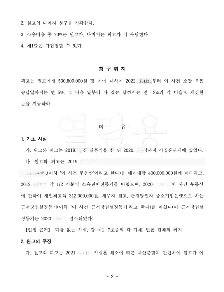 원고와 피고는 사실혼 관계였는데 사실혼 해소 후 원고는 의뢰인인 피고에게 약정금청구소송을 제기하면서 약정하지 아니한 대여금 등을 지급하라고 하여 이에 의뢰인은 저를 찾아오셨습니다.