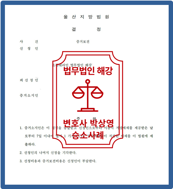 법무법인 해강에서는 법리적 검토와 준비서면 등을 통하여 의뢰인의 맞는 법률 조력을 하고자 노력하였고 [증거보전 인용 결정]에 성공 하였습니다.