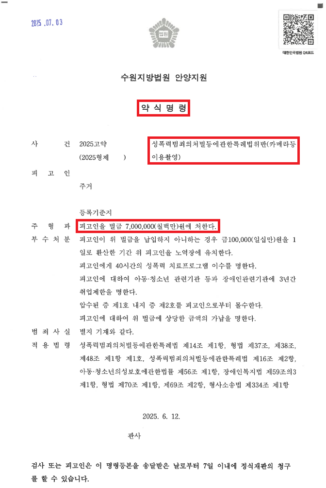 이러한 저의 조력을 바탕으로 A씨는 여자친구를 몰래 촬영하였을 뿐만 아니라 전후로 약 1년 동안 총 14회에 걸쳐 불특정 다수의 여성들을 몰래 촬영하였음에도 불구하고 약식명령으로 벌금형을 선고받음으로써 재판까지 나아가지 않고 사건을 최대한 가볍게 마무리할 수 있었습니다.