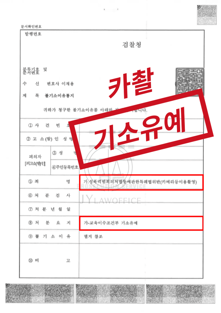 이와 같은 본 성범죄 전문 변호사의 조력에 따라, 의뢰인은 카촬 혐의에서 기소유예 의 처분을 받고, 사건을 무사히 종결시킬 수 있었습니다.