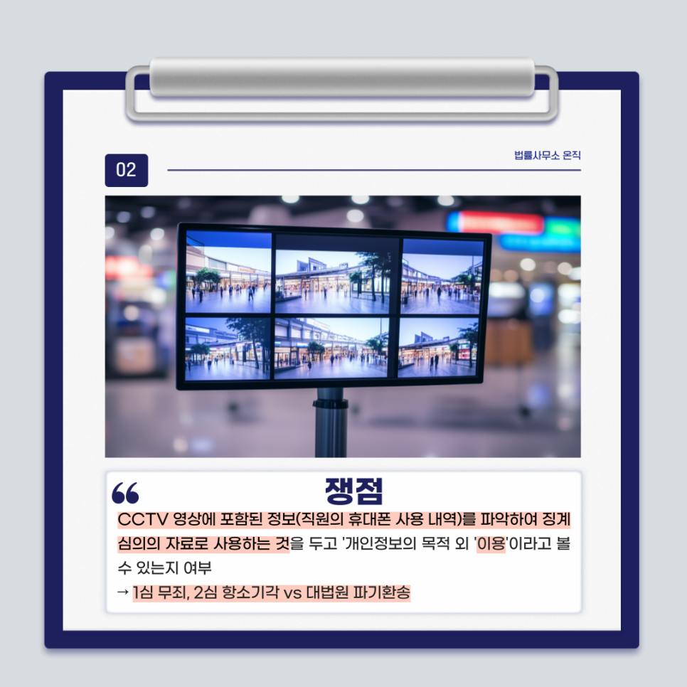 쟁점은 CCTV 영상에 포함된 정보(직원의 휴대폰 사용 내역)를 파악하여 징계심의의 자료로 사용하는 것을 두고 '개인정보의 목적 외 '이용'이라고 볼 수 있는지 여부였습니다.