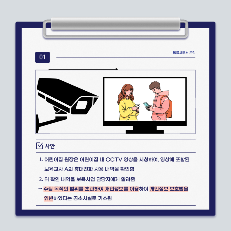 관련하여 바로 지난주(2025. 6. 26.) 대법원에서 어린이집 원장이 CCTV영상을 보고 보육교사의 휴대폰 사용내역을 확인인 후 보육사업 담당자에게 이 사실을 전달한 사안에서 개인정보보호법 위반을 인정하는 취지의 파기환송 판결을 한 사례가 있어 소개합니다.