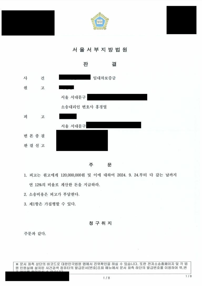 의뢰를 하여 진행한 사건으로 결론적으로 보증금 전액을 승소판결을 통해 집행으로 찾아드린 사건입니다.