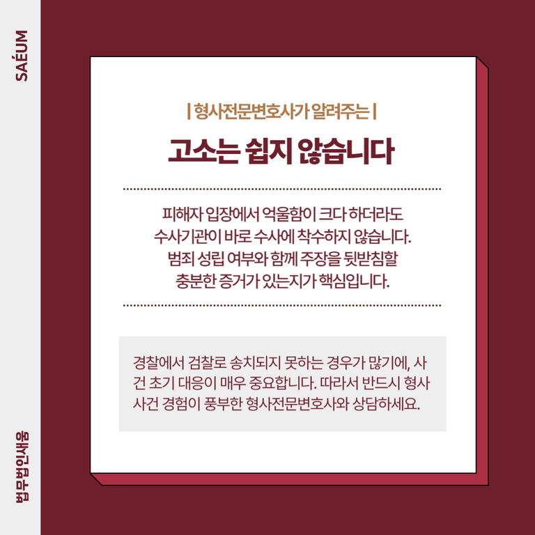 경찰에서 검찰로 송치되지 못하는 경우도 많기 때문에, 초기 대응이 매우 중요합니다. 반드시 관련 사건 경험이 풍부한 변호사와 함께 법리적 검토를 받고, 입증 가능한 증거를 수집해야 형사고소가 원활하게 진행됩니다.