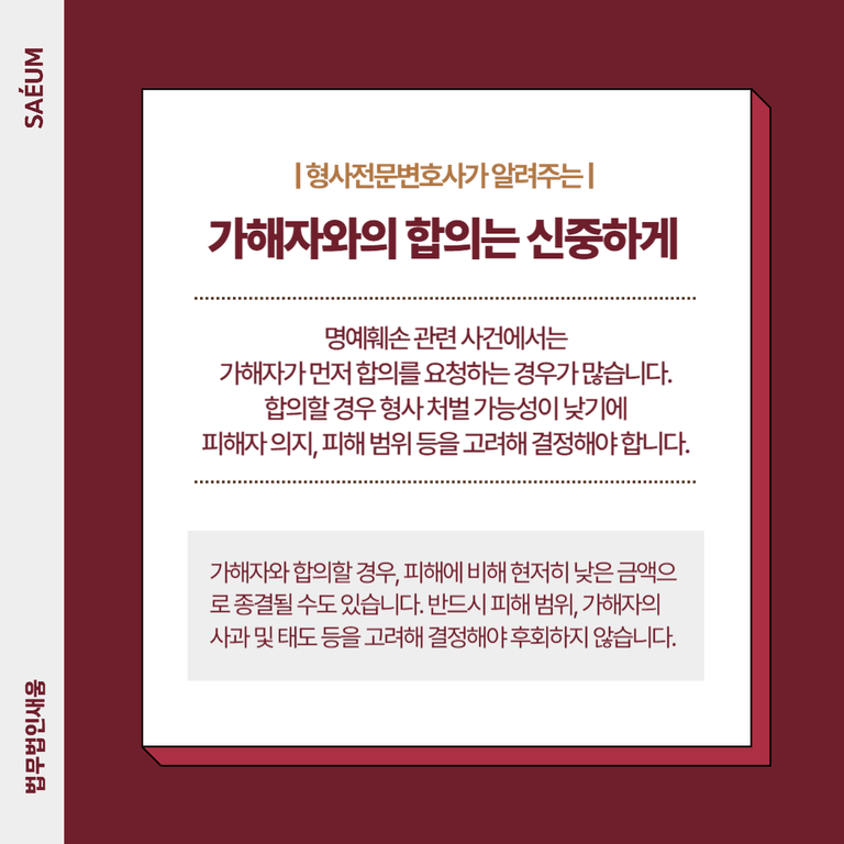 합의를 한다면 그만큼 형사 처벌의 가능성은 낮아지며, 피해에 비해 현저히 낮은 금액으로 종결될 수도 있습니다. 피해자의 의지, 손해의 범위, 가해자의 사과 및 태도 등을 종합적으로 고려해 결정해야 후회하지 않습니다.