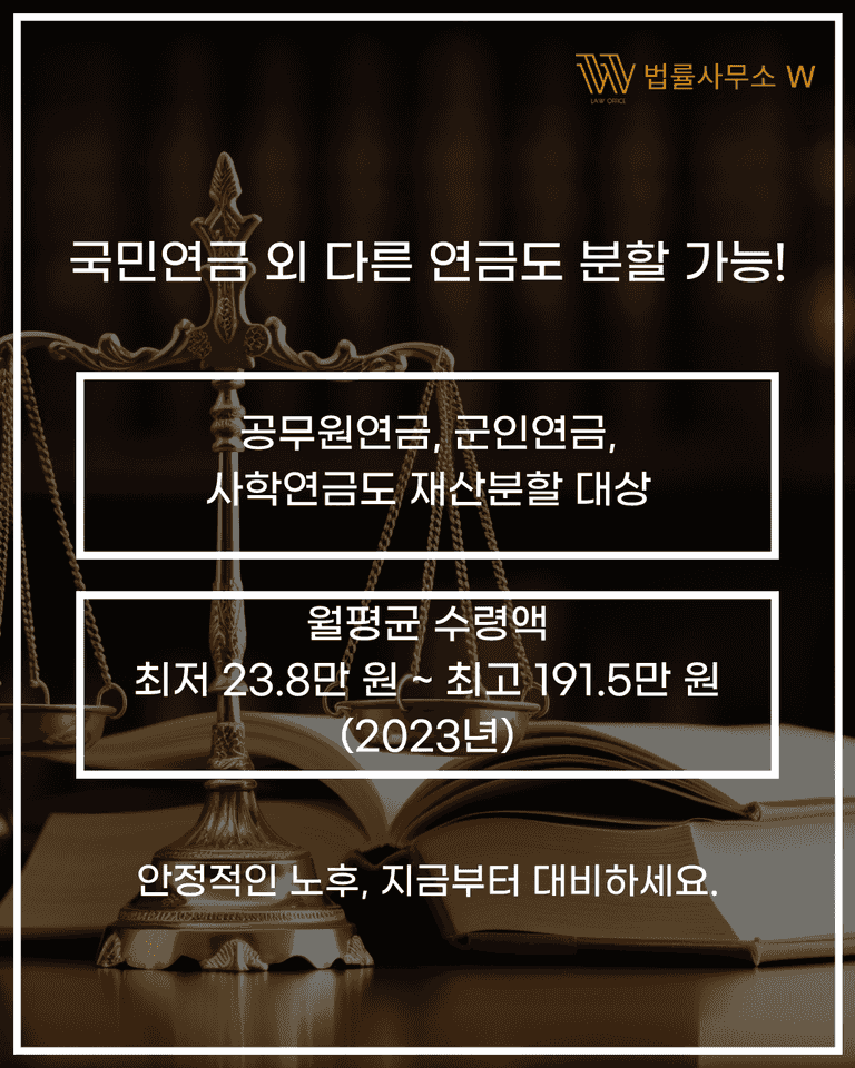 국민연금뿐 아니라 공무원연금, 사학연금, 군인연금 등도 모두 재산분할 대상입니다.