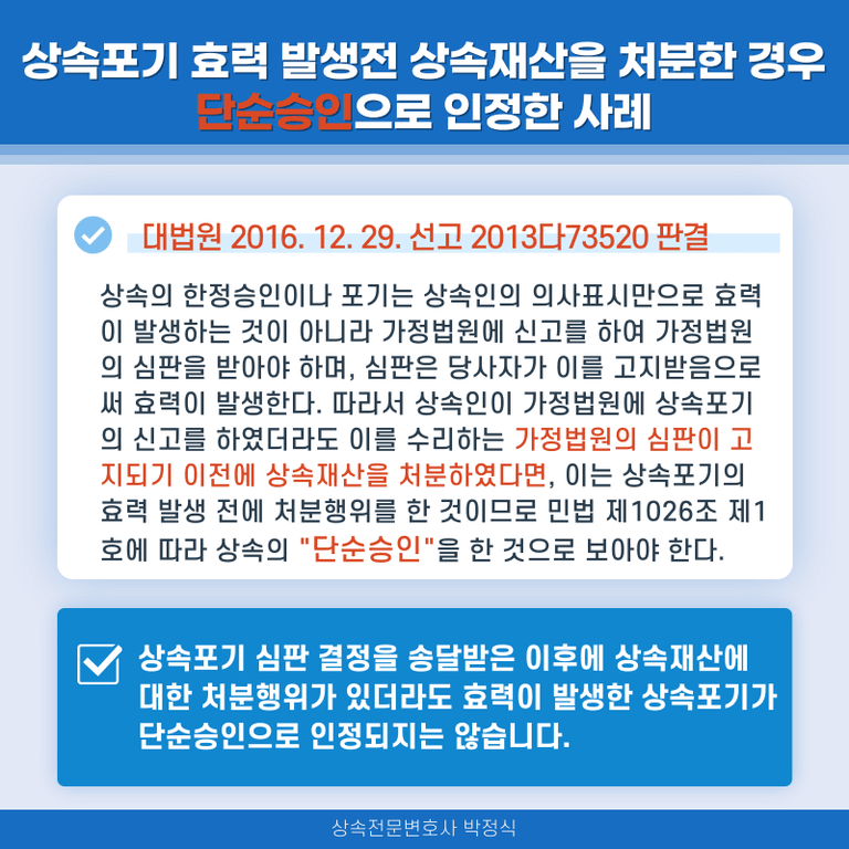 위와 같이 상속인이 상속포기를 하기 전에 상속재산을 처분하게 되면 상속을 승인한 것과 같은 결과가 발생하게 되고 상속을 승인한 이후에는 상속포기 신고를 하여 그 신고가 수리된다고 하더라도 상속포기로서 효력이 발생하지 않게 됩니다.