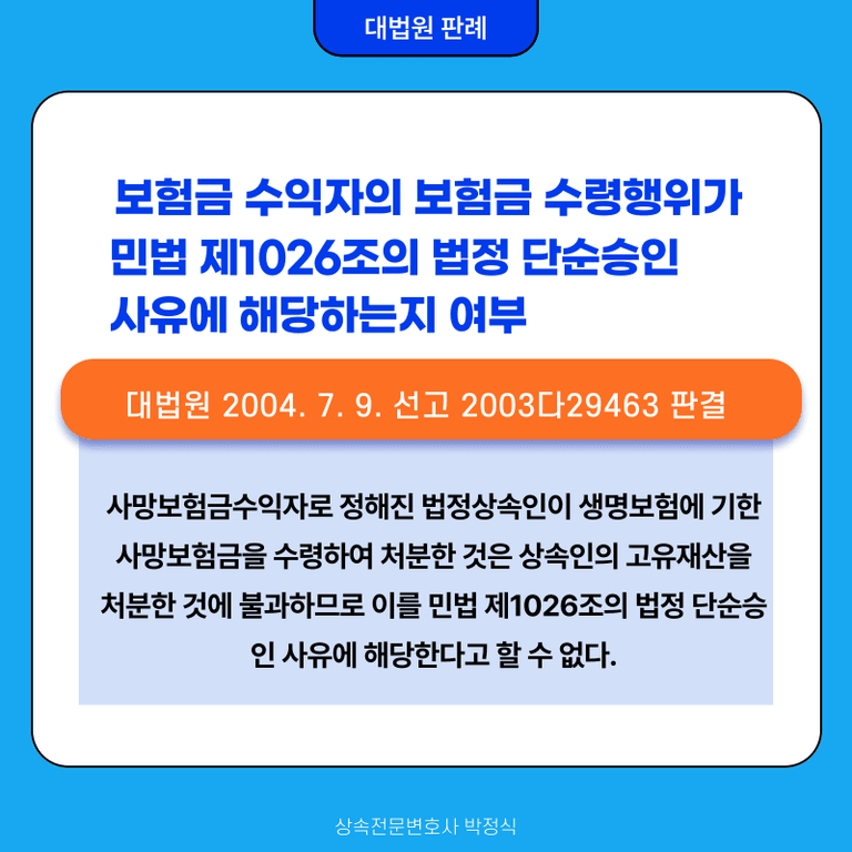 따라서 보험금 수익자로 지정된 상속인이 보험회사로부터 보험금을 수령한 이후에 상속포기나 한정승인 신청을 하더라도, 그러한 보험금 수령행위는 민법 제1026조의 1호의 상속재산 처분행위에 해당하지 않기 때문에 그로 인하여 단순승인으로 보지 않고, 상속포기나 한정승인이 그대로 인정되는 것입니다.