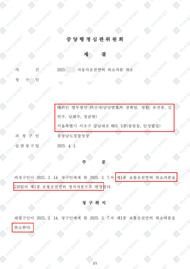 📌 "피청구인이 2025. 2. 14. 청구인에게 한 2025. 3. 7.자 제1종 보통운전면허 취소처분을 110일의 제1종 보통운전면허 정지처분으로 변경한다."