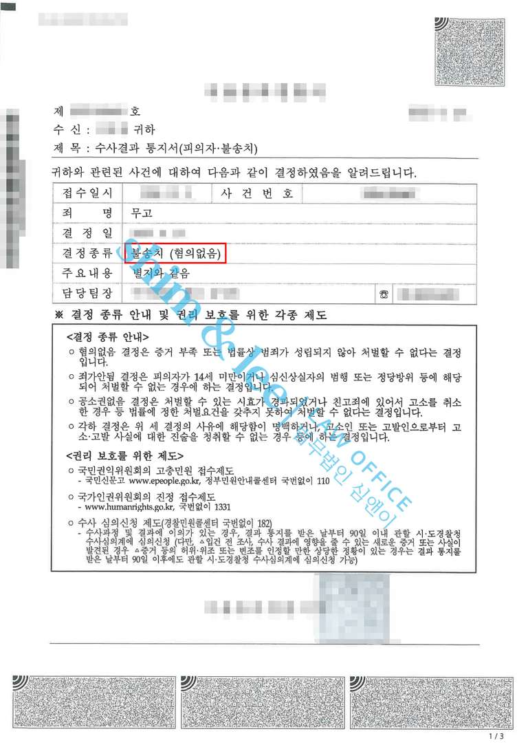 - 담당 수사관님은 사건의 본질을 빠르게 파악해 불과 한 달 만에 모든 혐의에 대해 불송치 결정을 내렸고, 의뢰인님은 짧은 시간 안에 억울함을 털어내고 다시 평온한 일상으로 돌아가실 수 있었습니다.