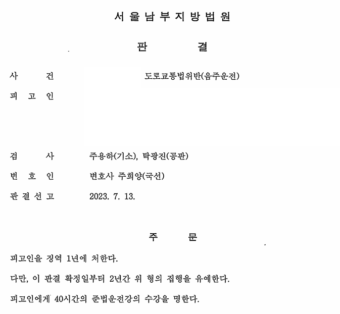 모든 정황과 서면, 반성문, 탄원서, 법리적 구조를 종합하여 재판부는 징역 1년에 집행유예 2년, 준법운전강의 40시간 이수 명령을 내렸습니다.