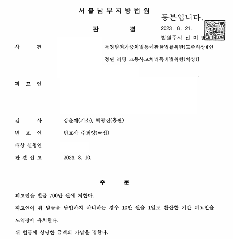 법원은 변호 측 주장을 받아들여 도주의 고의가 입증되지 않았다고 보고, 이에 따라 도주치상 혐의에 무죄를 선고했습니다. 피고인은 단순 교통사고처리특례법 위반(치상) 혐의로만 벌금 700만 원을 선고받아 일상으로 돌아갈 수 있게 되었습니다.