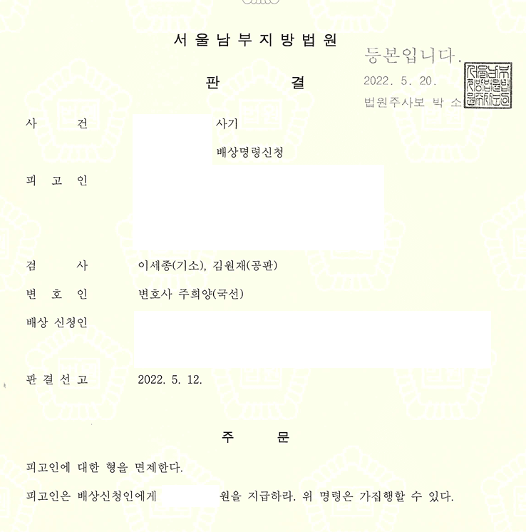 법원은 검찰의 주장과 변호인의 주장을 모두 검토한 끝에 피고인에게 형의 선고를 면제하면서, 피해자에 대한 배상명령만을 내렸습니다. 이는 사실상 형사처벌 대신 민사적 책임 중심으로 사안이 마무리된 것이며, 사건 초기부터 전략적으로 대응한 결과라 할 수 있습니다.