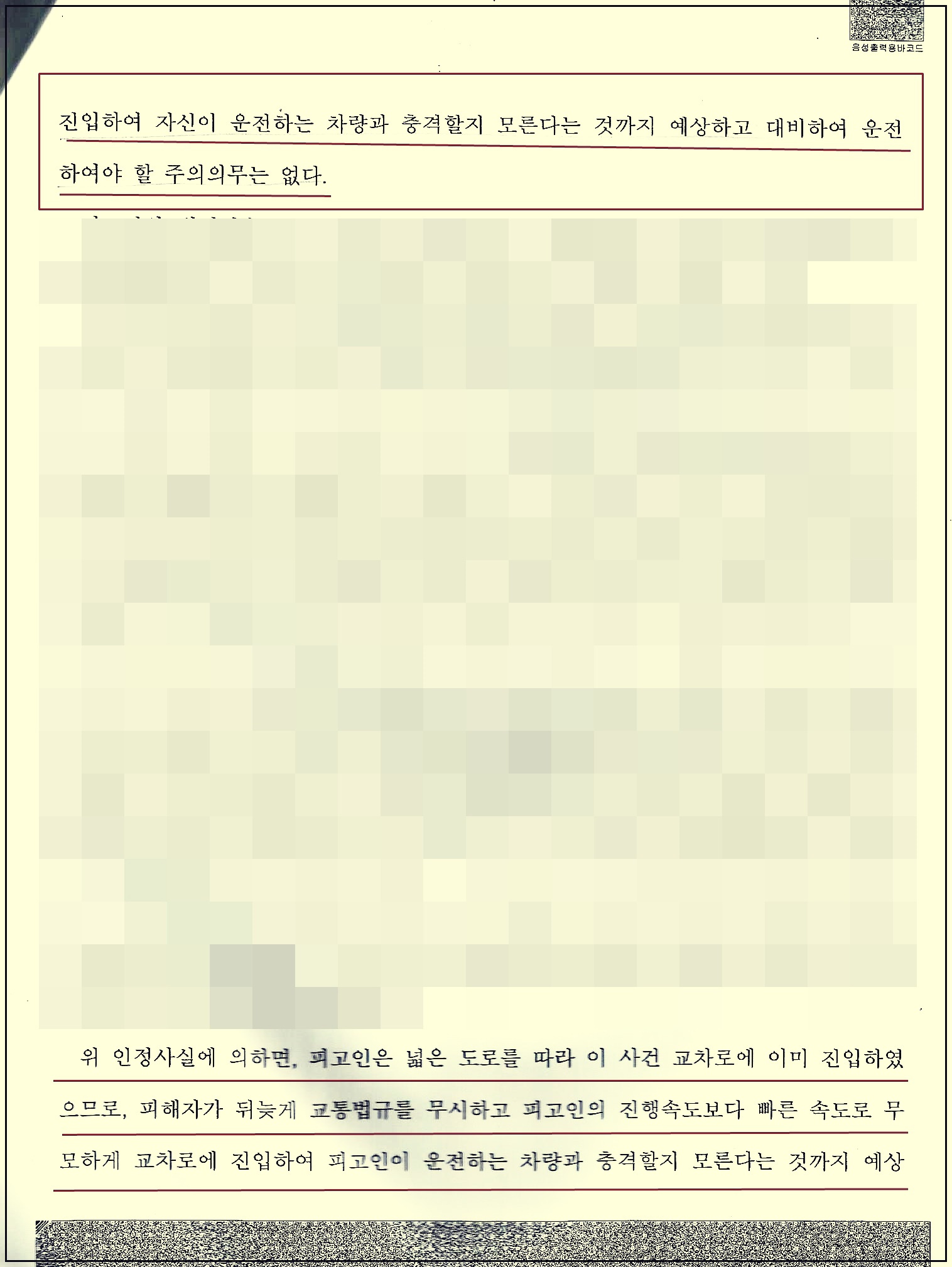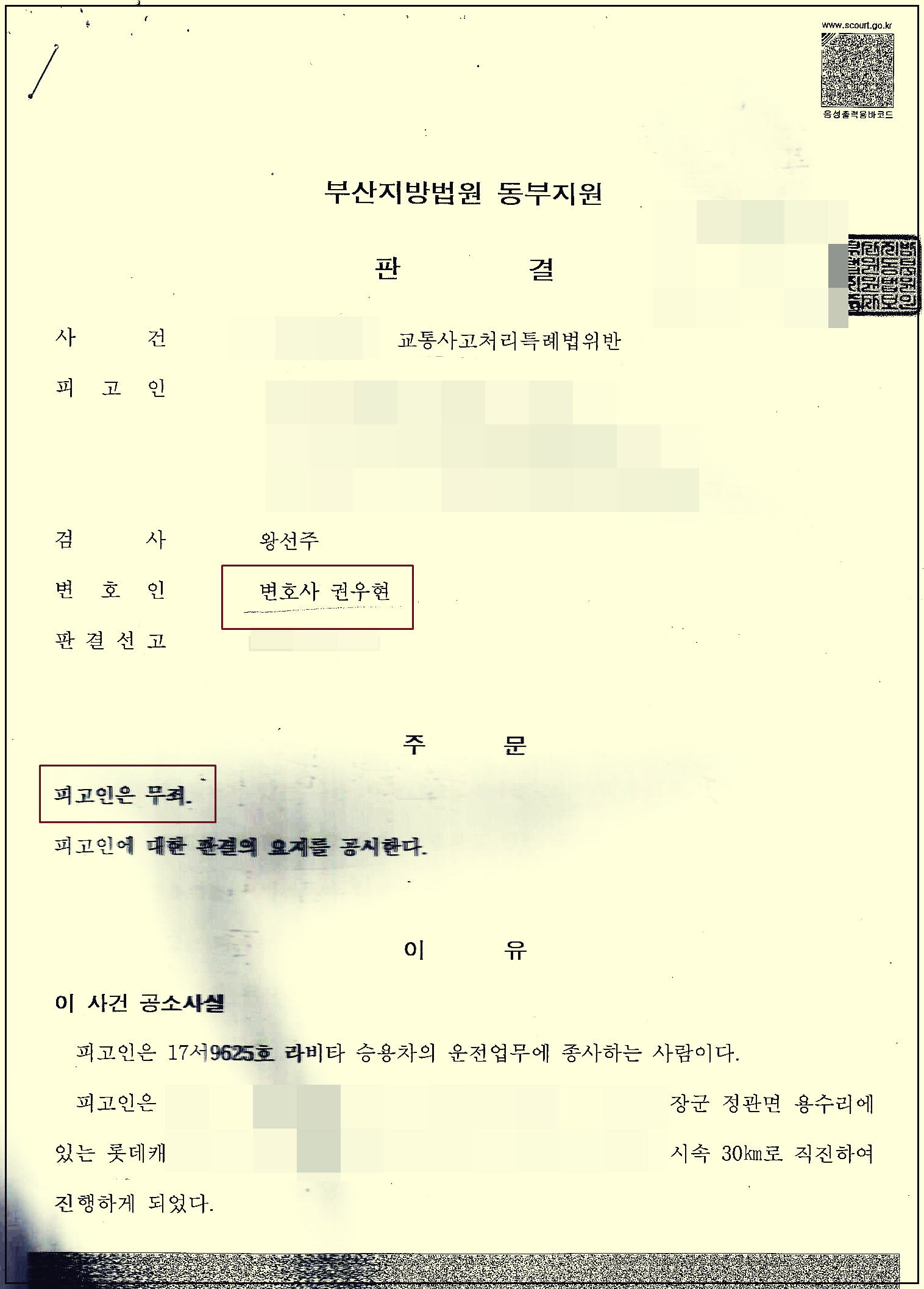 나. 아래 판결 사안의 경우 이러한 구분이 불명확 상황에서 대로 차 및 선진입 차에게 전방 좌우를 제대로 살피지 않은 과실이 있다는 이유로 소로 차 겸 후진입 차량의 운전자 사망사고에 대해 과실이 있다고 보아 교통사고처리특례법 위반으로 검찰이 기소한 사안인데, 판결 이유와 같이 피고인 운전의 차량이 대로에서 진입하였고 교차로에 선 진입한 사실을 인정하여 과실을 부정하고 무죄를 선고한 사안입니다.