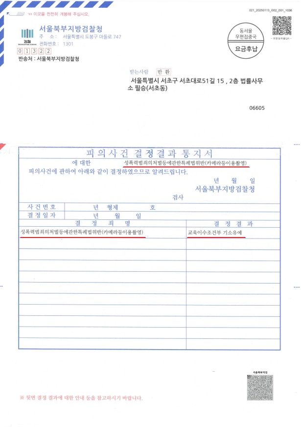 (카메라등이용촬영죄는 5년 이하의 징역 또는 3천만원 이하의 벌금에 처해지는 범죄이고 최근에는 실형이 선고되는 경우도 많습니다. 혐의가 인정될 증거들이 확보된 상황에서 기소유예는 최선의 결과임이 분명합니다)