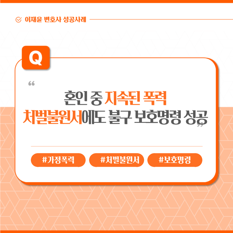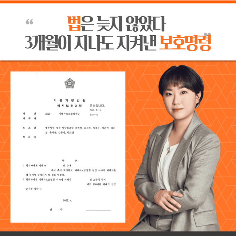 이에 따라 청구 후 1개월만에 ‘임시보호명령’이 내려져 의뢰인과 자녀는 상대방과 분리되어 안정적인 주거 환경을 누릴 수 있게 되었습니다.