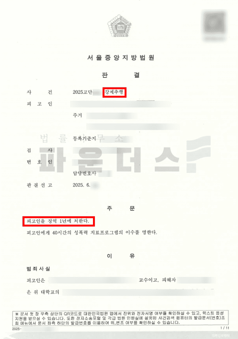 2차 추행 피해에 더하여 교내 허위 소문까지 피고인의 범행으로 인해 정신적 고통에 시달렸던 의뢰인의 강제추행 고소 결과는 피고인의 징역 1년 선고로 마무리되었습니다.