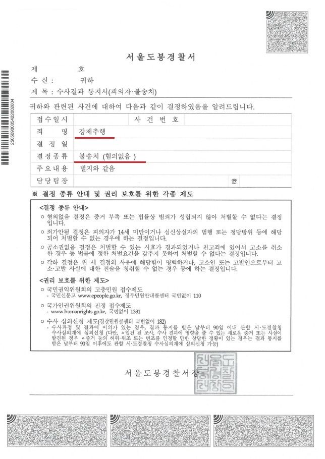 ※ 김준환 변호사와 함께 진행한 결과 서울도봉경찰서는 의뢰인님의 "강제추행"에 대하여 불송치(혐의없음) 처분을 하였습니다.