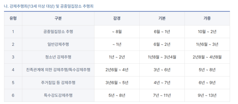 아래 그림은 강제추행과 관련한 양형기준표이니, 참고하시기 바랍니다.