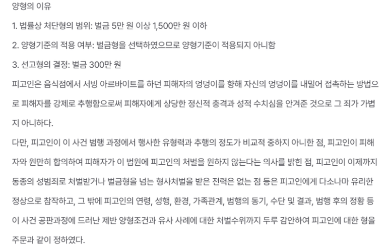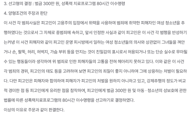 이 사건은 피해자와 합의하여 피해자가 피고인의 처벌을 원하지 않고 있다는 점, 강제추행의 정도가 비교적 경미한 점을 고려하여 벌금 300만원이 선고되었습니다.