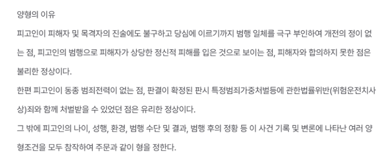 이 사건에서는 아래와 같이 유형력과 추행의 정도가 비교적 중하지 아니한 점, 피해자와 합의하였고 피해자도 처벌불원의사를 밝힌 점, 피고인이 동종의 성범죄로 처벌받은 전력이 없는 점, 유사 사례에 대한 처벌 수위까지 감안하였다고 합니다.