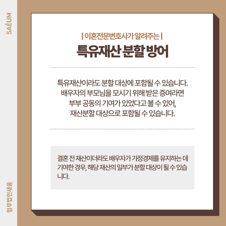 또한, 결혼 전 재산이더라도 배우자가 가정경제를 유지하는 데 기여한 경우, 해당 재산의 일부가 분할 대상이 될 수 있습니다. 따라서 특유재산의 분할을 원하지 않는 경우, 상대방의 기여가 없음을 입증하는 것이 중요하며, 불가피하게 포함된다면 기여도를 낮추는 방향으로 방어하는 전략이 필요합니다.
