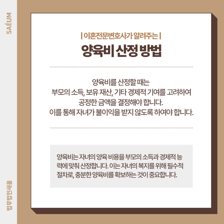 양육비는 자녀의 양육비용을 부모의 소득과 경제적 능력에 맞춰 분담하여 산정합니다. 이는 자녀의 복지와 성장 환경을 위해 필수적인 부분이므로, 합리적이고 충분한 양육비를 확보하는 것이 중요합니다.