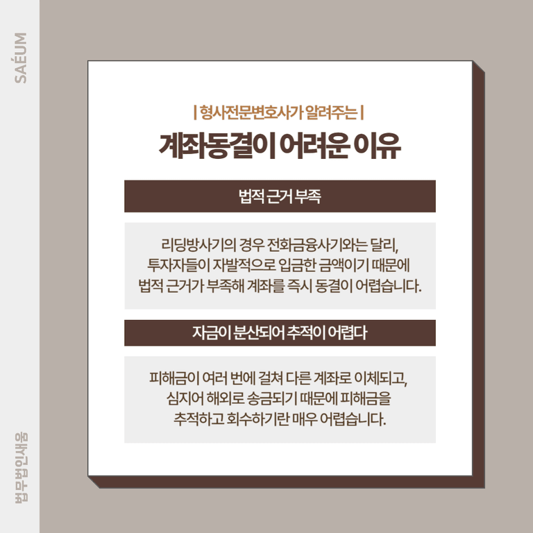 우리가 흔히 말하는 계좌동결은 법적으로 가압류라는 절차를 거쳐야만 가능합니다. 그러나 리딩방사기의 경우 전화금융사기와는 달리, 투자자들이 자발적으로 입금한 금액이기 때문에 법적인 근거가 부족해 계좌를 즉시 동결하는 데 어려움이 있습니다.