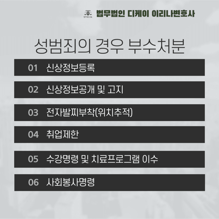 또한 단순한 형벌을 넘어서 신상공개, 취업제한, 전자발찌 등 부수처분으로 인하여 성범죄의 경우 보다 정확하고 빠른 대응이 필요하게 되었습니다.