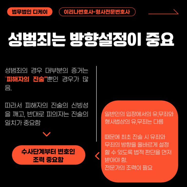 그렇기에 특히 성범죄의 경우는 경찰 조사 단계부터 전문가인 변호사와 상담을 통하여 사건의 진행 방향을 정하는 것이 무엇보다 중요합니다.