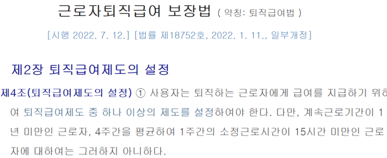 이에 대하여, 「근로자퇴직급여보장법」제4조에 따라 사용자는 사업장에서 4주간 평균하여 1주간의 소정근로시간이 15시간 이상이고 계속근로기간 1년 이상인 근로자가 퇴직하는 경우 급여를 지급하기 위하여 퇴직급여제도를 설정하여야 한다고 규정하고 있습니다.