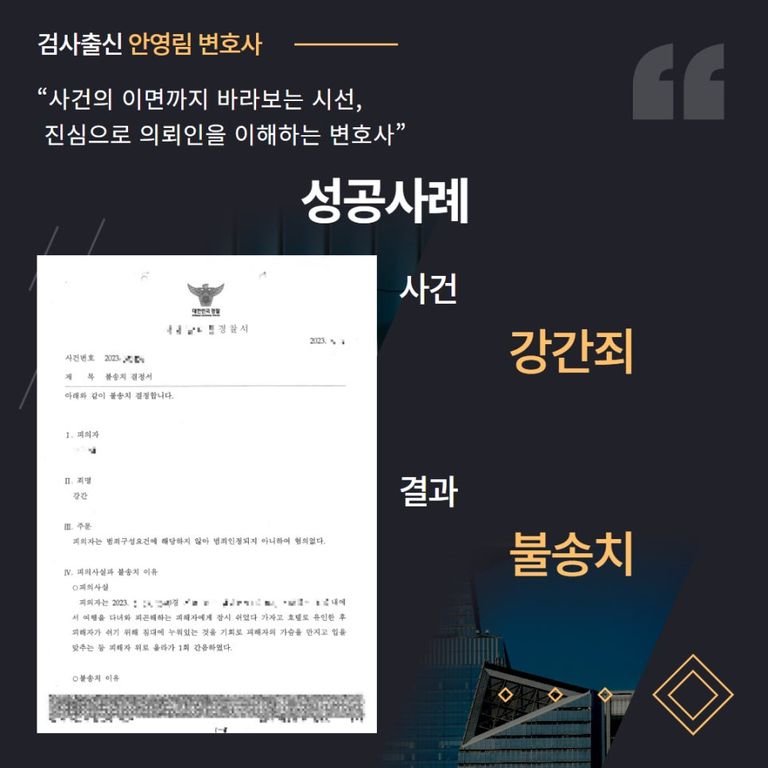 의뢰인이 연루된 강간죄 혐의에 대해서는 ‘혐의없음(불송치)’ 결정을 내렸습니다.
