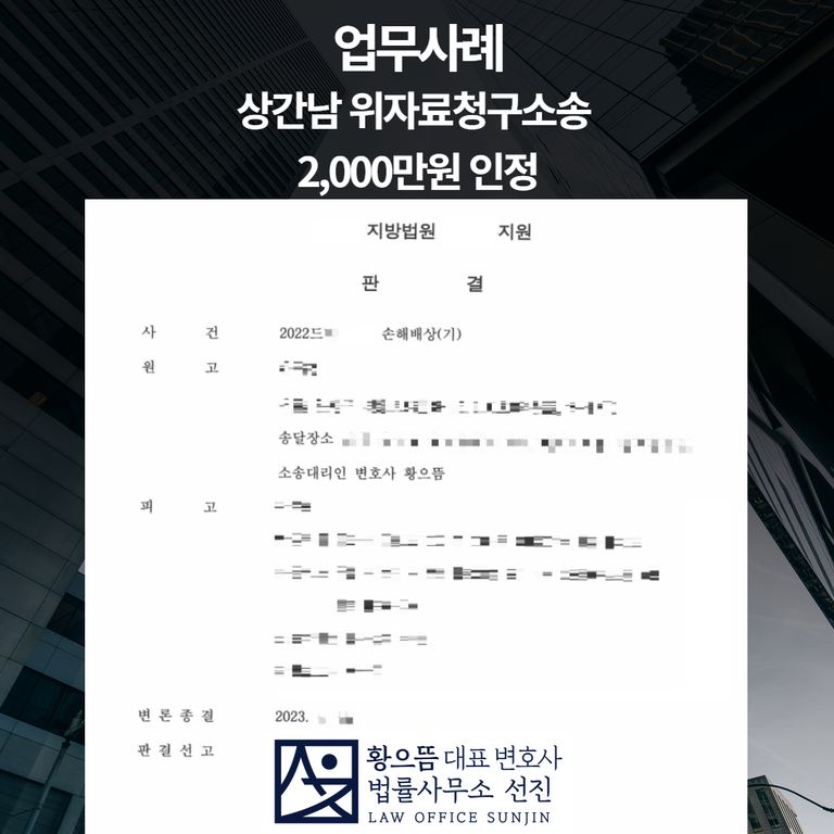 상간남 H씨가 의뢰인에게 위자료 2,000만원을 지급하라는 판결을 선고하였습니다.