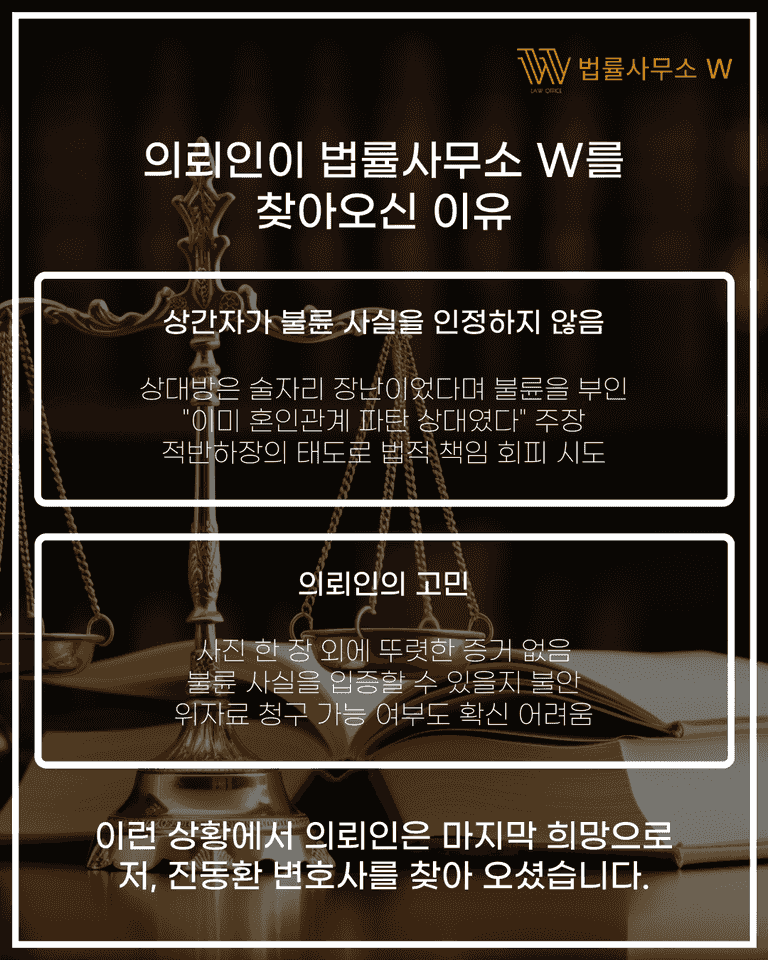 상간소송은 감정만으로 해결되지 않습니다. 상대의 부인과 방어 논리를 꿰뚫는 전략이 필요합니다.