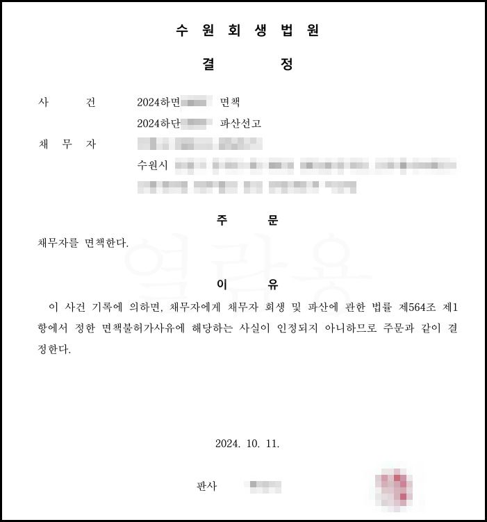 의뢰인의 파산신청을 받아들여 2억 6천만 원전액 면책 결정을 내렸고,