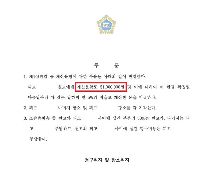 1심에서는 의뢰인에게 위자료 2천만 원, 재산분할 비율 50:50으로 보아
