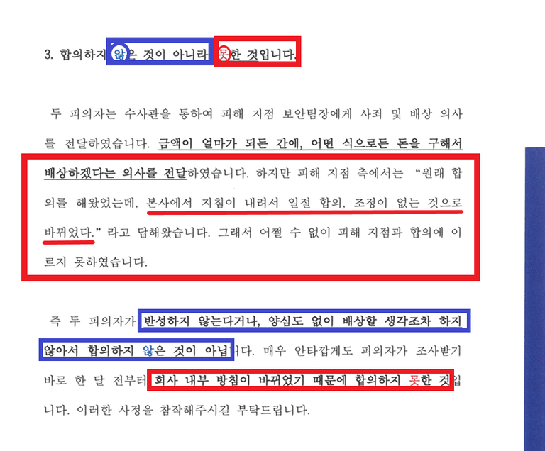 저는 경찰에 한 번, 검사에게 한 번, 총 2차례에 걸쳐 의견서를 제출하였습니다. 그 안에는 아래 내용이 담겼습니다.