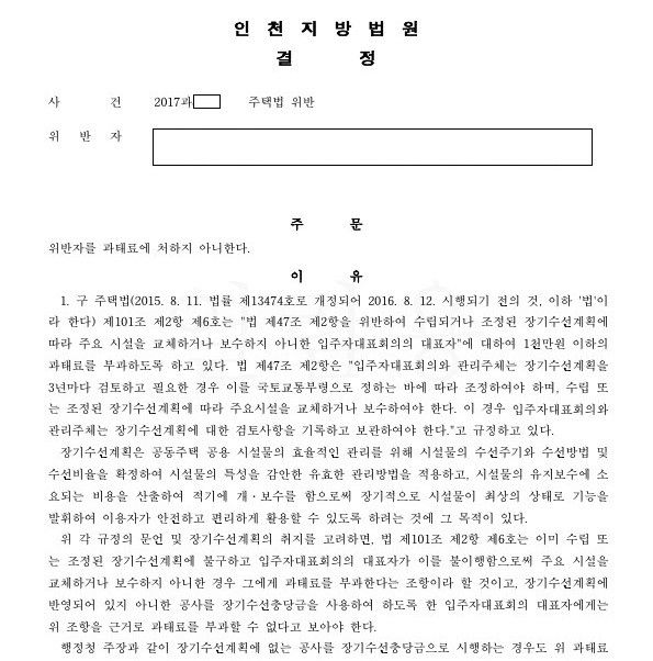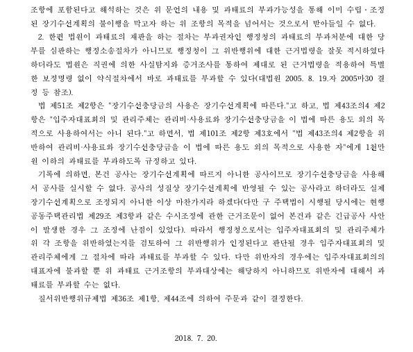A구청장이 장기수선계획에 없는 공사를 장기수선충당금으로 시행한 입주자대표회의 회장에게 과태료 1000만원을 부과하였으나, 입주자대표회의 회장을 대리하여 과태료재판을 통하여 승소한 사건