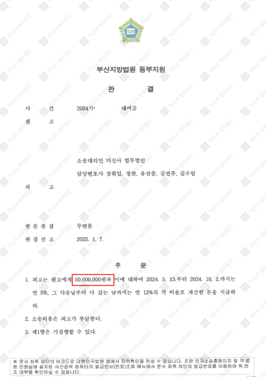 재판부는 변호인이 제출한 문자·카카오톡 내용, 계좌거래내역, 제3자 진술 등을 종합적으로 판단하여, 대여금의 존재를 인정하고 전액 반환하라는 판결을 내렸습니다. 판결 후 상대방의 재산을 신속히 파악해 가압류 및 강제집행 절차도 함께 진행하여, 실제로 보전된 금액을 회수하는 데 성공했습니다.