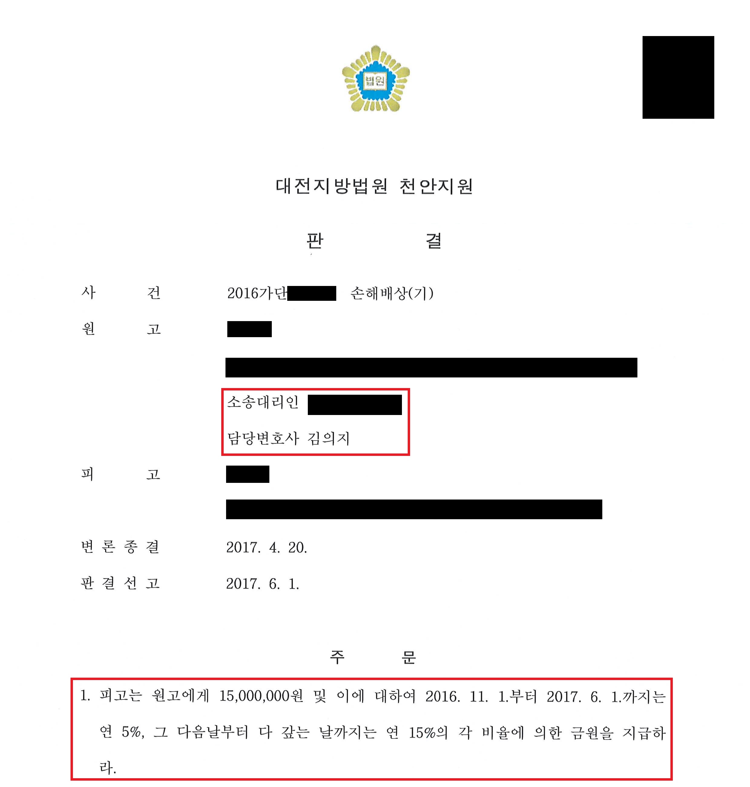 보통 위자료 액수는 '배우자와 이혼 및 별거 여부, 배우자 및 상간녀의 사회적 지위와 재력, 부정행위의 기간 및 정도, 원고의 정신적 피해 정도' 등을 종합적으로 고려하여 산정하는데, 위 사례는 실제로 남편과 이혼하지 않았고 부정행위 기간이 1년 미만으로 짧은 편이었기 때문에 위자료 액수가 다액으로 인정되지는 않았습니다. 그러나 부정행위가 인정되지 않아 패소할 수 있었던 사건을 '검증목적물 제출명령신청'을 통하여 승소로 이끌었던 사건이었습니다.