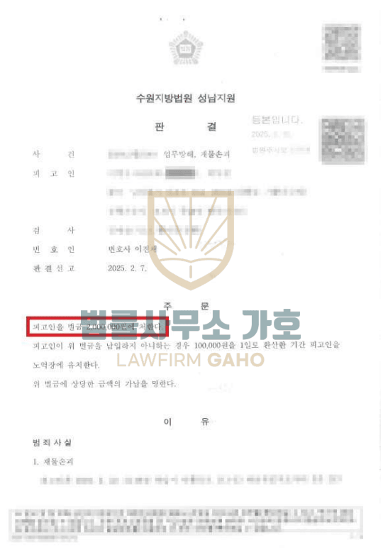 의뢰인은 술에 취한 상태에서 자신이 거주하는 오피스텔 관리사무소에 찾아가 항의하던 중 감정이 격해져 관리사무소의 문을 부수고 직원들 앞에서 소리를 지르다가 재물손괴 및 업무방해 혐의로 현행범 체포까지 되는 등 중대한 위기를 맞이한 상황이었습니다.