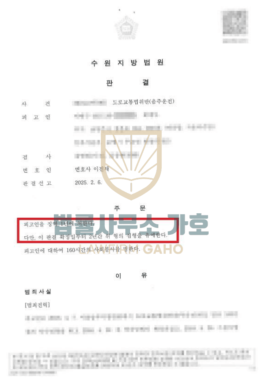 집행유예 선고(징역 1년, 집행유예 2년, 160시간 사회봉사)