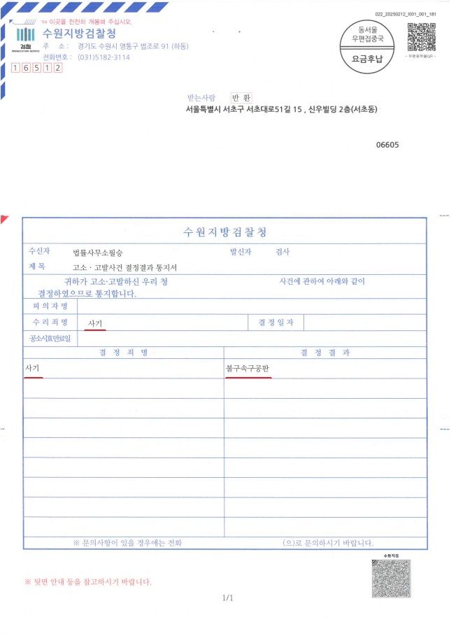 다만 사기죄는 합의가 이루어져도 죄가 인정되면 처벌도 이루어지기 때문에 수원지방검찰청은 피의자를 불구속구공판(기소)하였습니다