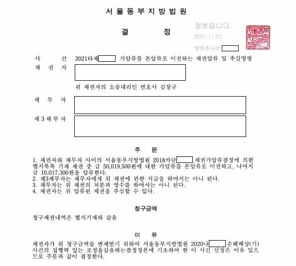 사전에 가압류하였던 예금채권에 대하여 본안사건 확정 후 본압류 및 추심명령 결정을 받음