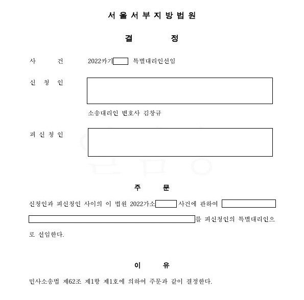피고가 미성년자이고, 친권자 등 법정대리인이 없는 상황이어서 법원이 보정권고로 특별대리인선임신청을 권고하여 특별대리인선임신청을 하여 받아들여짐