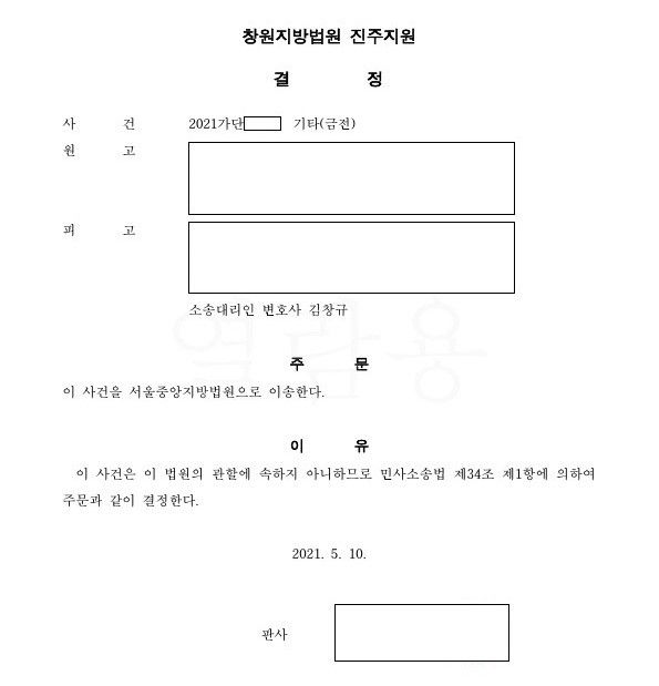 상대방이 잘못된 관할법원에 소장을 접수하였는데, 이에 관할위반의 항변을 하여 받아들여짐