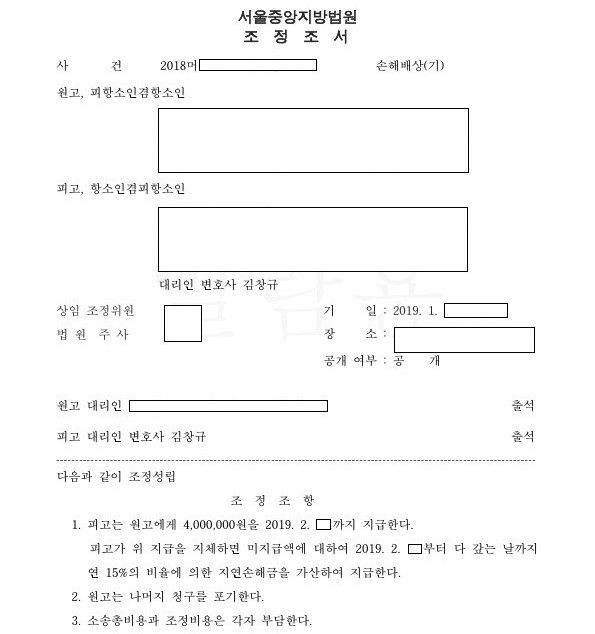 상대방이 부당해고를 이유로 위자료 등 1,365만원을 청구하는 손해배상청구소송을 제기하였는데, 400만원으로 감액하는 내용으로 조정