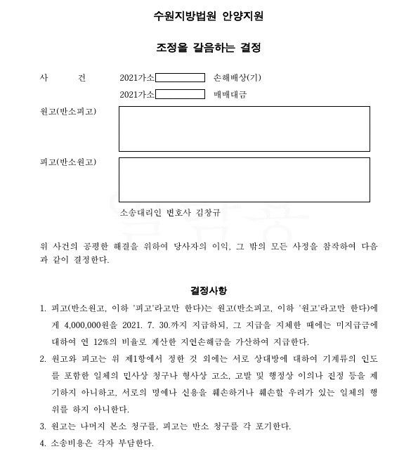 의뢰인이 판매한 기계를 매수한 상대방이 의뢰인을 상대로 물건에 하자가 있다고 주장하면서 2,967만원의 손해배상청구를 하였는데, 의뢰인이 상대방에게 400만원을 지급하는 내용으로 강제조정결정이 확정됨